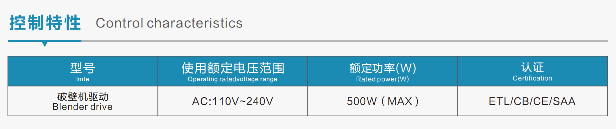 This blender motor driver supports AC 110V-240V wide voltage input with a peak rated power of 500W, holding ETL/CB/CE/SAA safety certifications for multiple countries.