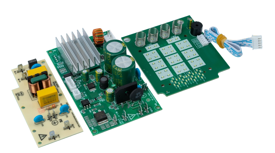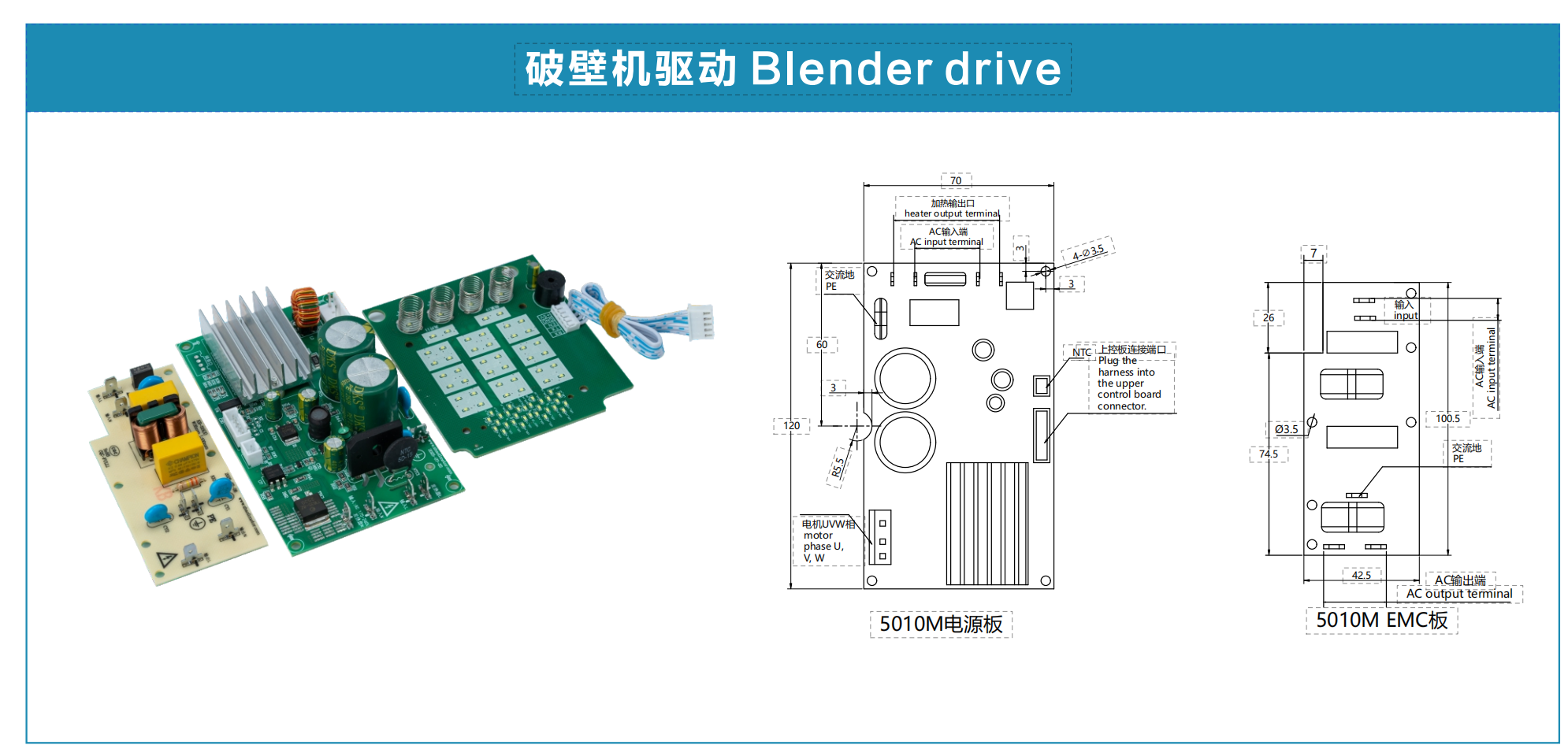 The MCU controller and power drive module convert wide-range AC/DC input into controllable drive signals. Combined with closed-loop feedback, this enables precise motor speed regulation and stable operation. Integrated safety protections against overheating, overload, and overvoltage, along with EMC filtering, support high-load start/stop scenarios for high-power blenders.